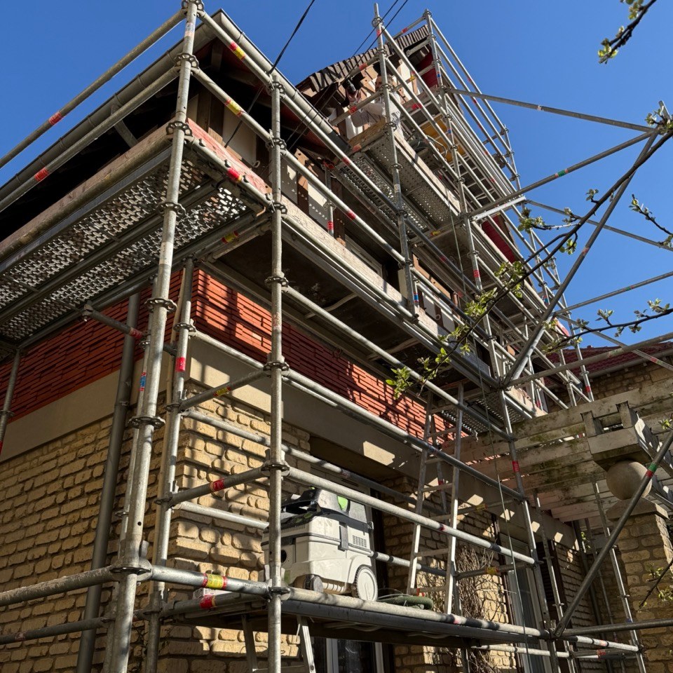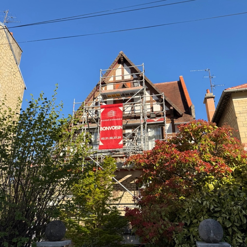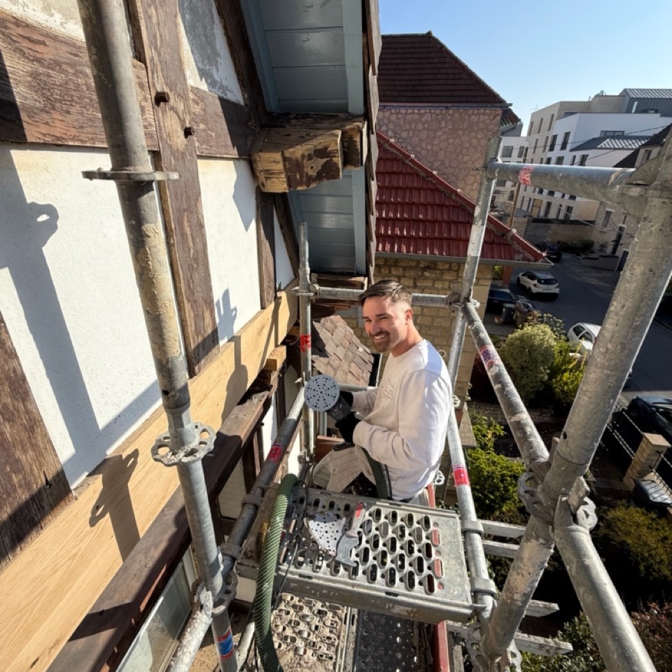 Rénovation d’une façade à colombages avec un gros travail de préparation.